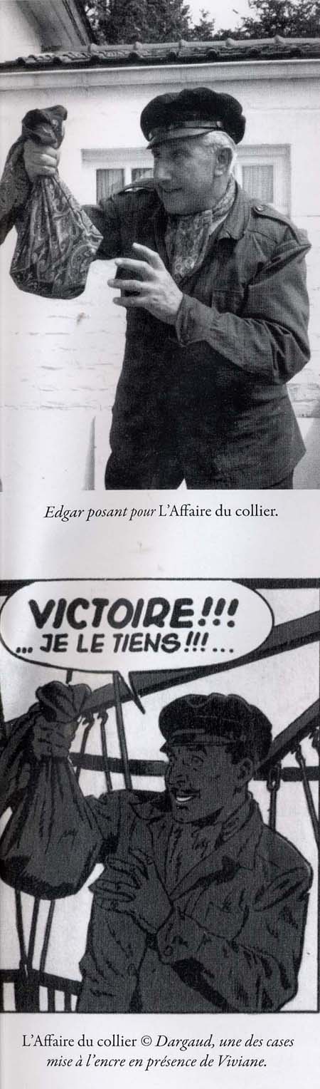 La photo « Edgar posant pour L’Affaire du collier » et la case mise à l’encre en ma présence (voir ci-contre en dessous de la photo) illustrent bien mon ouvrage.